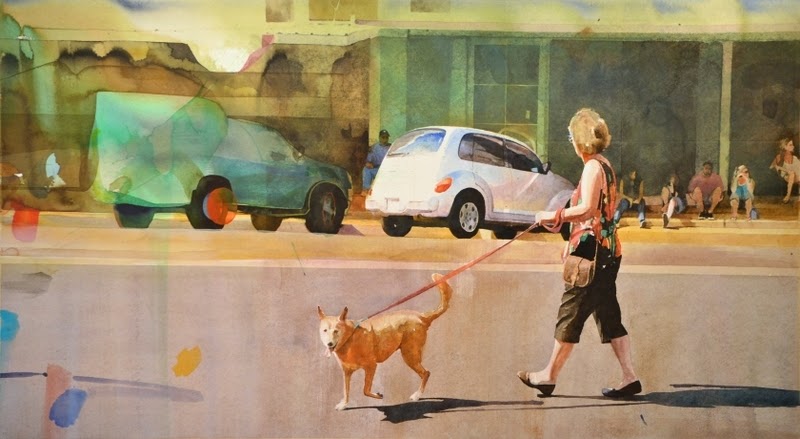 So what to make of a three-legged dog with its tongue hanging out? And an owner's gaze stolen by what's shiny. Furthermore, the direction of their path, right to left, moving backward, a regression, disintegrates into what I hope will only be playful.
